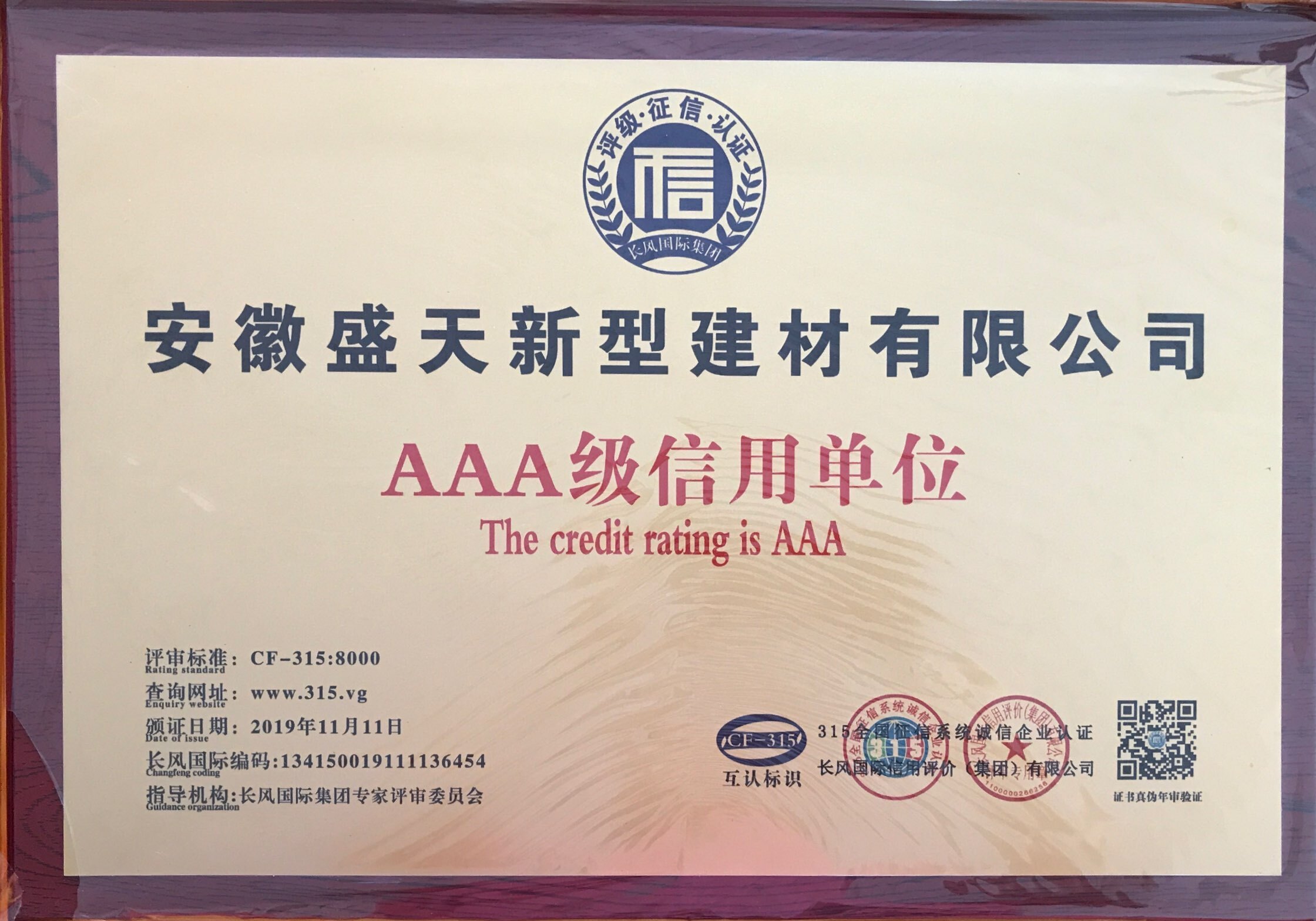 安徽盛天資信等級被評為AAA級,被列為“重合同 守信用”單位。
