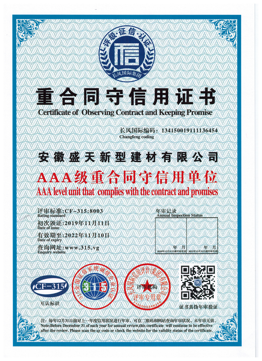 安徽盛天資信等級被評為AAA級,被列為“重合同 守信用”單位。