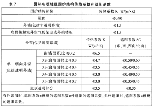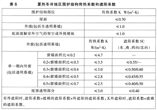 對于嚴寒地區,基本不考慮建筑物的遮陽問題,對于寒冷地區、夏熱冬冷地區、夏熱冬暖地區除了考慮建筑物的保溫還應考慮建筑物的遮陽問題。表6、表7就給出了夏熱冬冷地區、夏熱冬暖地區傳熱系數和