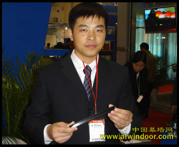 圖二 泰諾風保泰的銷售工程師劉旭,在展臺前向中國幕墻網記者展示該公司隔熱條產品