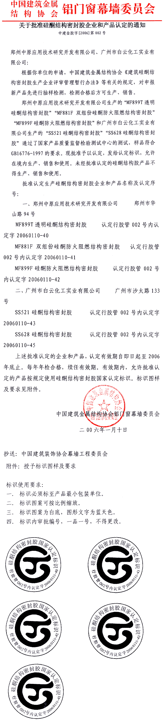 關于批準硅酮結構密封膠企業和產品認定的通知[06]第002號