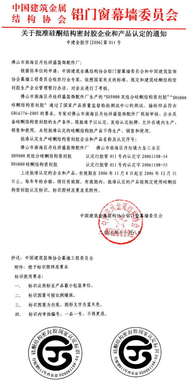 關于批準硅酮結構密封膠企業和產品認定的通知 011號