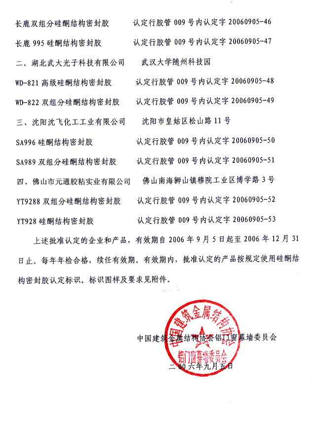 2006年關于批準硅酮結構密封膠企業和產品認定的通知