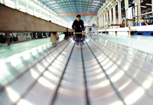 佛山一鋁材企業生產車間里工人們正忙碌地加工鋁型材(記者 何波圖)