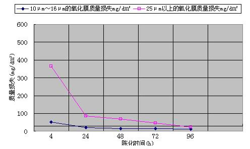 北京有色金屬研究總院“七五”攻關項目中,所研究的對象都是一些陽極氧化膜厚度相對比較薄的樣品,其中膜厚最高的是20μm,對于高膜厚(如超過25μm)的陽極氧化膜未見封孔陳化時間的論述。然而對于膜厚在25μm以上的陽極氧化膜,采用硝酸預浸磷鉻酸法檢驗其封孔質量與封孔后放置時間的關系,是否也和膜厚小于20μm的陽極氧化膜的封孔質量與封孔后放置時間關系一致呢?我們還不得而知。因此,我們對不同膜厚級別的陽極氧化膜,其封孔質量與封孔后放置時間的關系進行了試驗研究。