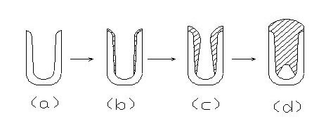 李宣、朱祖芳等[2]根據重量法對陽極氧化膜的封孔過程以及封孔膜的溶解過程的試驗,結合俄歇電子能譜等表面物理儀器的觀測認為較厚的陽極氧化膜,封孔反應主要在氧化膜微孔的外層區域發生,反應產物可能只將孔的外層區域封閉,內層區域仍未填滿,見圖4。