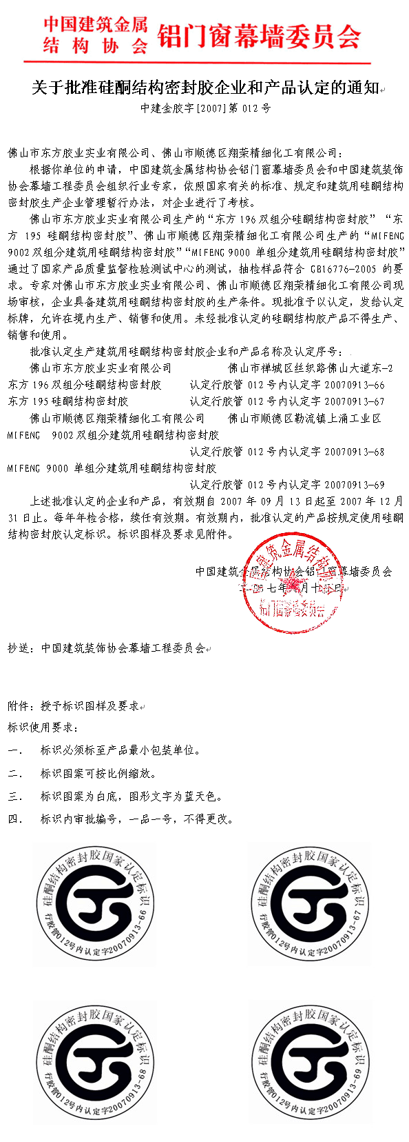 關于批準硅酮結構密封膠企業和產品認定的通知[2007-012]