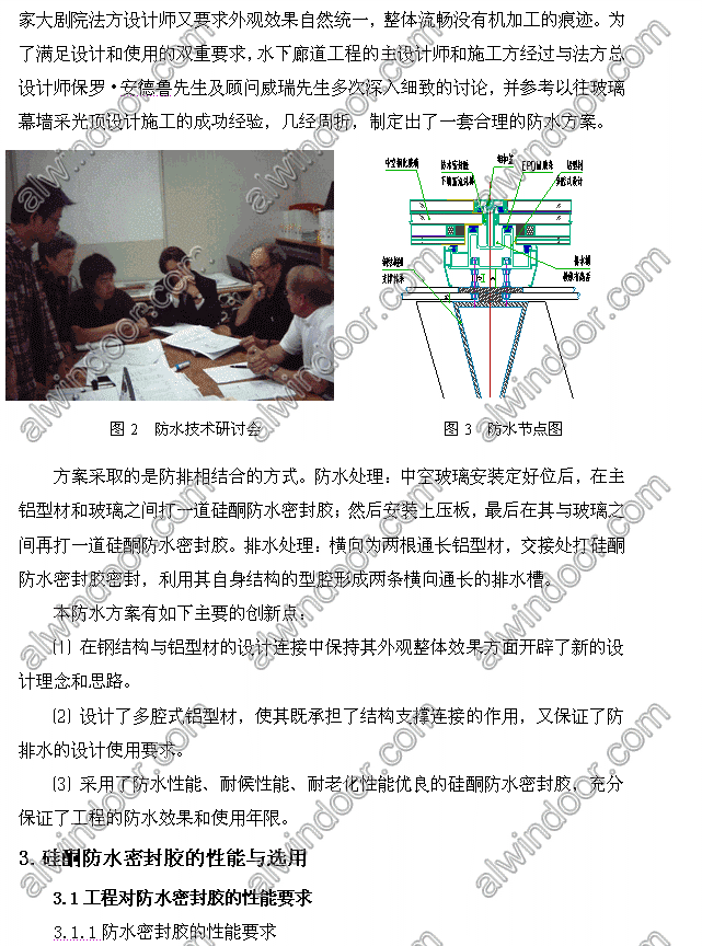 This is mainly about the watertight construction and requirements of the National Grand Theater underwater gallery, and focuses on the performance of silicone waterproof sealant selected on this project. Through the imitation test and actual application it shows that the innovative structure meets the dual requirement for construction landscape effects and waterproof function perfectly. 關鍵詞:
