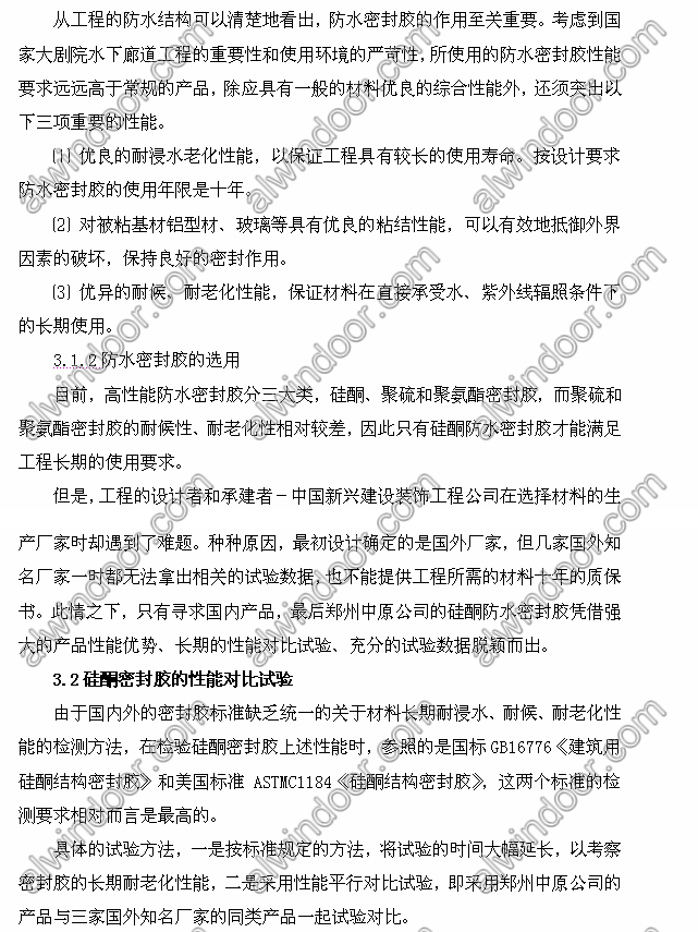 This is mainly about the watertight construction and requirements of the National Grand Theater underwater gallery, and focuses on the performance of silicone waterproof sealant selected on this project. Through the imitation test and actual application it shows that the innovative structure meets the dual requirement for construction landscape effects and waterproof function perfectly. 關鍵詞: