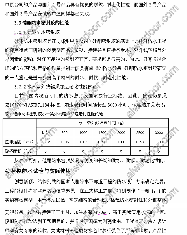 This is mainly about the watertight construction and requirements of the National Grand Theater underwater gallery, and focuses on the performance of silicone waterproof sealant selected on this project. Through the imitation test and actual application it shows that the innovative structure meets the dual requirement for construction landscape effects and waterproof function perfectly. 關鍵詞: