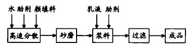 先將水、分散劑、潤濕劑、成膜助劑、多功能助劑攪拌均勻,在高速分散下加入顏填料、中空微珠后進砂磨,使?jié){料細(xì)度達到40um以下,然后在慢速攪拌下加入乳液、消泡劑、增稠劑,用氨水調(diào)pH值至8一9,即可過濾出料。