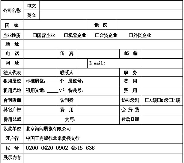 2、申請得到組委會確認后,七個工作日內將參展費用(50%預付款或全款,展前退展,定金不予退還)電匯或交至組委會;