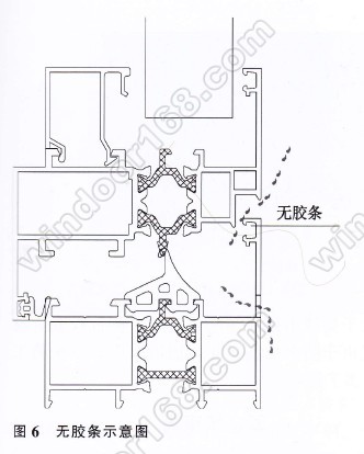 2.開啟部位在開啟扇下側使用擋水膠條時可以大量減少雨水從框扇間的縫隙處進人集水腔,如不使用擋水膠條(如圖6所示)雨水會通過縫隙進入集水腔,風雨較大時',受風壓與大雨的影,進入集水腔的雨水不能快速排除增加了漏水隱患。經實驗得出,在開啟扇的左、右、下三邊增加擋水膠條效果最佳。上邊不能放置擋水膠條的原因是利用等壓原理,使集水腔與外界通過上部通氣實現等壓。通過對8O0×1200的開啟窗進行水密性實驗得出,左、右、下三邊加擋水膠條水密性可達繡0Pa,不加擋水膠條水密性為250Pa,四邊全加擋水膠條水密性為350Pa。