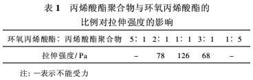 表1的結果表明,在惰性稀釋劑作用下,丙烯酸酯預聚物 與環氧丙烯酸酯的自交聯在質量比為1∶1時拉伸強度達到 126Pa。然而,在成膠時活性單體與環氧丙烯酸酯、丙烯酸酯 低聚物的共同作用是不容忽視的。