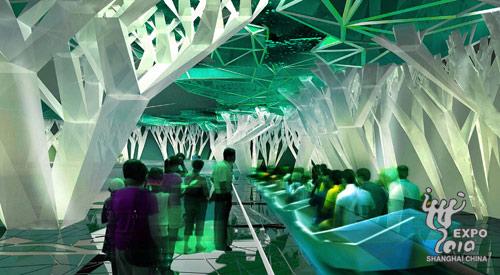 緊接著,觀眾在前往41米展廳的途中,可以看到意象化的綠色植物將建構出一個夢幻的綠色環境,其中還穿插新老城市人在同一屋檐下和諧相處的影像裝置。