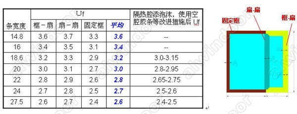以左固定右平開窗型為例,使用不同寬度隔熱條的型材U值對比如表1: