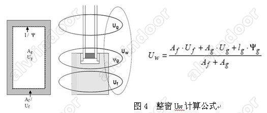 門窗是一個綜合了各種材料的系統產品,整窗的傳熱系數Uw值跟玻璃、型材及中空玻璃間隔條三個因素相關,根據JGJ/T 151-2008《建筑門窗幕墻熱工計算規程》,其整窗Uw的計算公式如下(見圖4):
