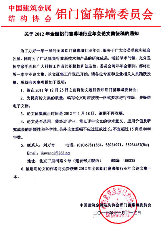為了辦好一年一屆的全國鋁門窗幕墻行業年會,服務于廣大會員單位和社會各屆,同時為了廣泛征集行業新技術和產品的研究成果,活躍學術氣氛,充分發揮專家學者和廣大科技工作者的積極性和創造性,委員會每年年會期間,都將出版一本專業論文集。 點擊下載 2012年年會論文集論文格式樣例