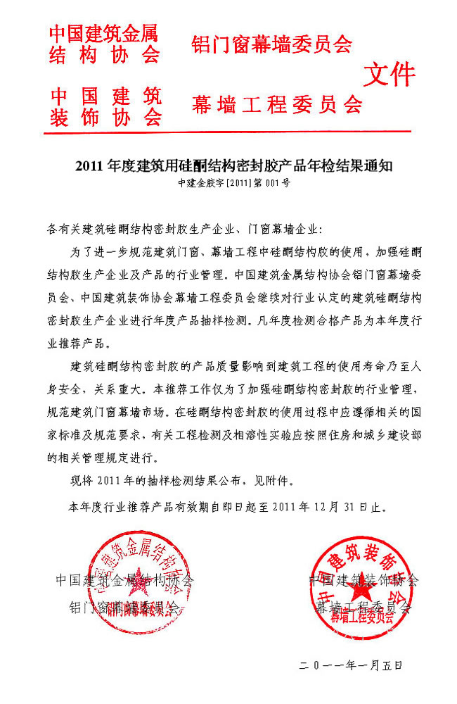 關于批準硅酮結構密封膠產品認定通知 中建金膠字[2011]第001號文件