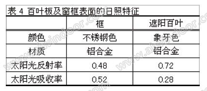 表3表示從條件 0到條件 3的計(jì)算對象,即推拉門(A-1)、內(nèi)平開固定窗組合窗(A-2),外平開門(A-7)的外觀圖和商品特征。條件 0是被比較的基準(zhǔn)對象窗。門窗一直在關(guān)閉狀態(tài),并且使用一般的中空玻璃。條件1是有通風(fēng)換氣功能的門窗,對門窗在開啟或使用通風(fēng)功能的情況下進(jìn)行評價(jià),門窗即使在關(guān)閉的情況下也可以通過通風(fēng)器來進(jìn)行通風(fēng),與條件一樣使用普通的中空玻璃。條件2是帶有遮陽功能的窗,室外側(cè)玻璃(5-A9-5的普通中空玻璃)和室內(nèi)側(cè)玻璃(3毫米的浮法玻璃)當(dāng)中安裝有可收納的遮陽百葉構(gòu)造裝置,通過調(diào)節(jié)百葉來達(dá)到遮蔽太陽光的效果,表4表示的是百葉片和框表面的日照特性,百葉片的節(jié)角度為45度。條件3是結(jié)合條件1的通風(fēng)換氣功能和條件2的遮陽功能于一體的門窗。