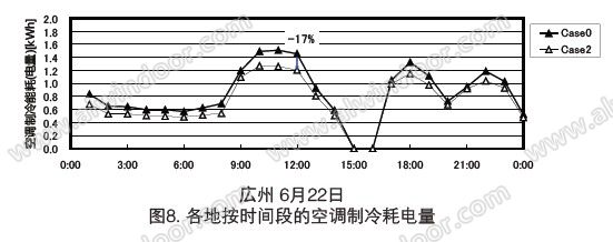 緩解日間用電高峰與削減二氧化碳排放大戶的火力發(fā)電設(shè)施的電力輸出密切相關(guān)。因此,從節(jié)能與控制地球溫室化效應(yīng)來(lái)看,是重要的組成部分。空調(diào)制冷的耗電量在日間太陽(yáng)處于最高位置及運(yùn)轉(zhuǎn)開(kāi)啟后的瞬間會(huì)達(dá)到峰值。在此,我們通過(guò)各時(shí)間段的空調(diào)制冷耗電量來(lái)闡明通過(guò)遮陽(yáng)功能對(duì)緩解用電