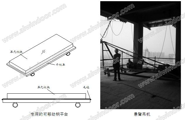 單元式幕墻板塊的垂直運輸采用自行設計制作的懸臂吊機進行,懸臂吊機配備卷揚機,速度較電動葫蘆快,將單元式幕墻板塊提升或送入指定的樓層位置;樓層設置專用的可移動鋼平臺,可移動鋼平臺裝有滾輪,可以在樓內進行移動,到達指定位置。