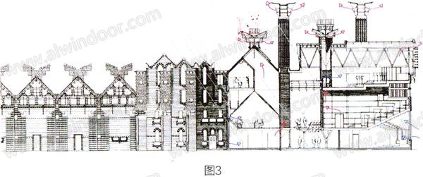 英國倫敦的德蒙特福德大學圖書館的建筑設計中采用了多個通風豎井和大面積的采光天窗。該建筑充分利用了熱空氣的“煙囪效應”,將較熱的廢氣由豎井排出,將較冷的新風吸入室內,在空調和暖通系統的配合下調節室內溫度,并保持室內空氣的新鮮。大面積的采光天窗被巧妙地布置在屋面上,通過反射和散射轉化成柔和的自然光,為人工照明系統提供了有益的補充。值得注意的是,這個建筑在充分利用周圍環境的同時并沒有摒棄人工氣候調節系統,而是更有效率地利用它,而且確保了較高的容積率和較低的體形系數,這些對于我們改造既有建筑具有相當的借鑒價值。