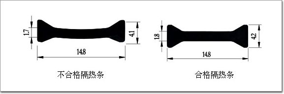 合格隔熱條尺寸精確,外形美觀;不合格隔熱條輪廓尺寸不精確 ;
