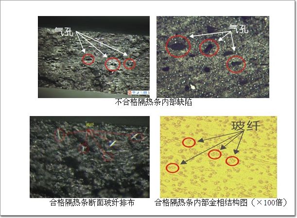 不合格隔熱條:內部結構疏松,玻纖含量少,甚至沒有玻纖,并含有大量氣孔,嚴重影響隔熱條的強度;