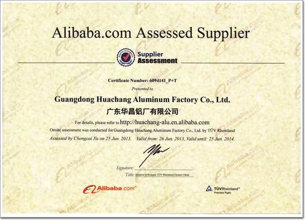 2013年7月15日,廣東華昌鋁廠有限公司成功通過了德國萊茵TUV的資格認證,獲得了阿里巴巴認證供應商的證書。