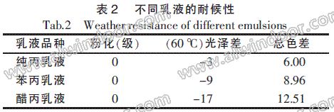 黃瑩等[12]比較了純丙乳液、苯丙乳液和醋丙乳液經室外曝曬40 d 后的耐候性(表2),并發現樣板均無開裂、脫落現象。由表2 可知:3 種乳液漆膜變化程度由小到大依次為純丙乳液<苯丙乳液<醋丙乳液,即純丙乳液的耐候性相對最好。