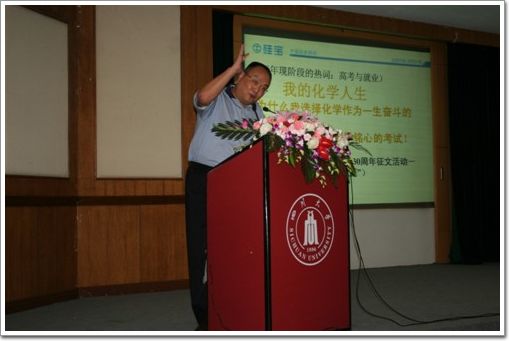 失敗乃成功之母,這是王躍林博士以自己的親身經歷“十分考卷與他的化學生涯”引出的觀點,勉勵同學們要不怕失敗,不拋棄,不放棄,終能成功。