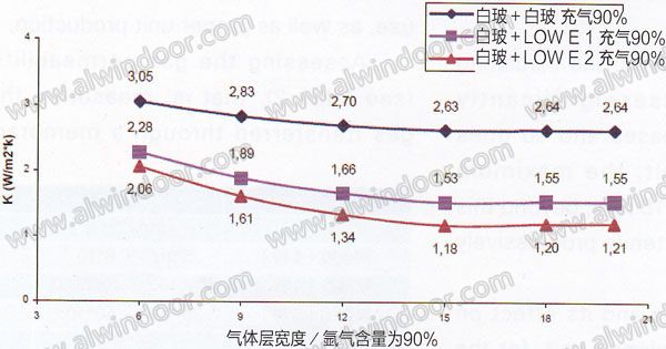而當氣體層寬度超過一定限度時,氣體的隔熱性能就會大大降低,這是因為氣體層的增加導致對流增強,從而熱傳遞也隨之增加。為了達到最佳效果,氣體層的寬度建議在16mm左右,如果大于這個寬度隔熱性能將不會繼續增加。