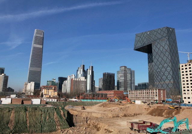 北京CBD正在建設多幢摩天大樓,左側高樓為國貿三期