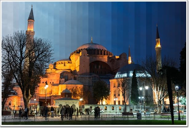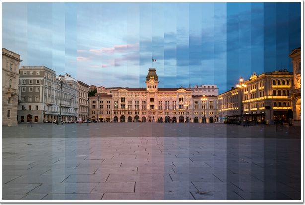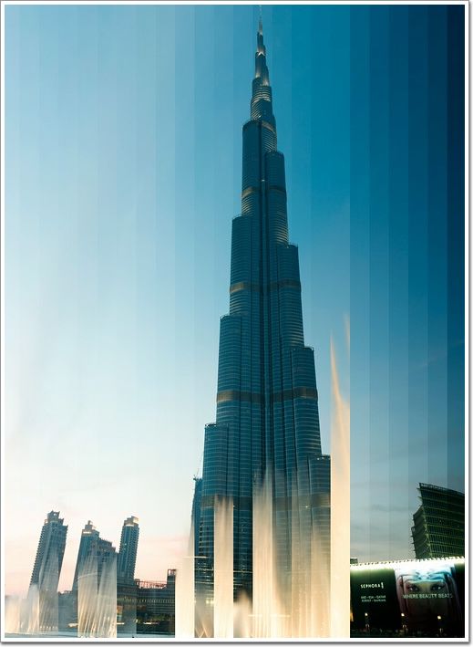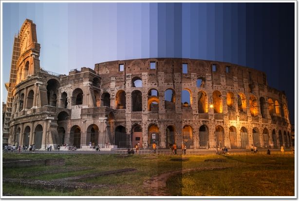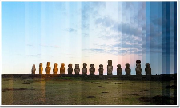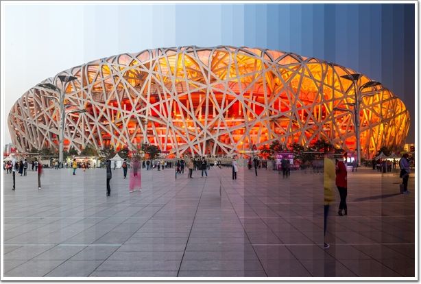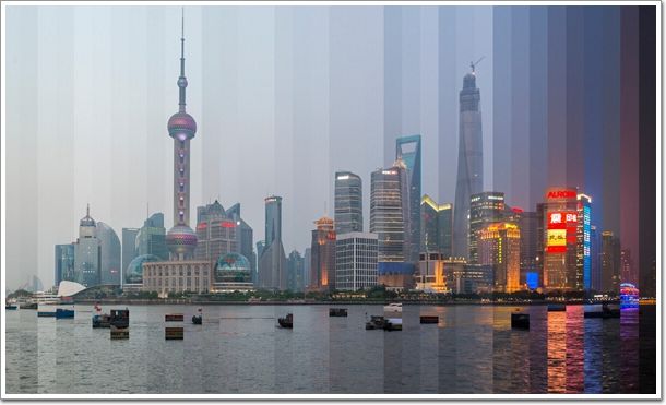 將一處標(biāo)志性建筑從白天到黑夜24小時(shí)不同時(shí)段的照片剪輯到一起。這些標(biāo)志性建筑從白天到夜晚光線變幻下的不同面貌,每一張圖片都由36張?jiān)谝惶觳煌瑫r(shí)刻拍攝的照片剪輯而成從左到右表現(xiàn)一天的變化。
