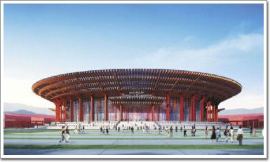 雁棲湖國際會展中心位于北京市懷柔區雁棲鎮,是規劃中雁棲湖會展區的核心建筑。主體建筑平面(詞條“平面”由行業大百科提供)為圓形,樓層平面直徑156.5m,屋蓋平面直徑183.0m,建筑面積約為7.9萬m2。地上2層,局部有夾層,檐口高度31.9m,主要功能為會議、展覽大廳等;地下3層,主要功能為新聞發布、辦公、宴會廳、車庫、設備用房等。建筑效果圖見圖1。