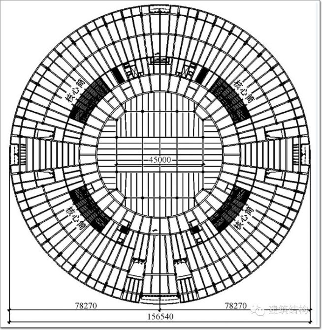 結構剖面圖及平面圖見圖2~4。會展中心結構體系采用鋼骨混凝土框架-鋼筋混凝土剪力墻(詞條“剪力墻”由行業大百科提供)體系,主要抗側力構件為沿圓形主會場周圈布置的核心筒及弧形剪力(詞條“剪力”由行業大百科提供)墻,墻厚300mm。