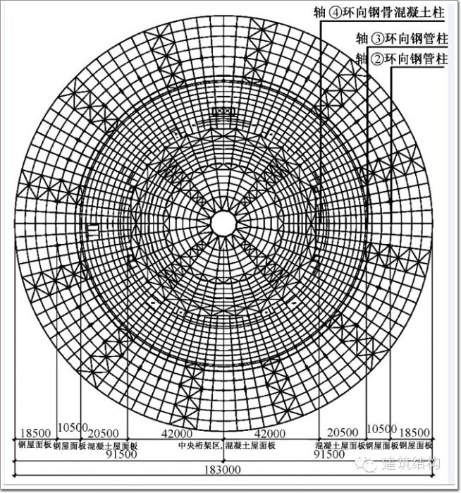 首層及以下為鋼骨混凝土框架結構(詞條“框架結構”由行業大百科提供),首層以上主要采用鋼框架結構;支承中央大跨度屋蓋的周圈柱采用直徑為1200mm的鋼骨混凝土柱,自下而上貫通設置。主會場樓面結構跨度45m,采用雙向主次鋼梁體系承重,并采用TMD消能減振系統改善舒適度性能。主會場屋頂結構跨度84m,采用放射狀布置的空間鋼桁架體系。基礎為天然地基和梁筏式基礎。