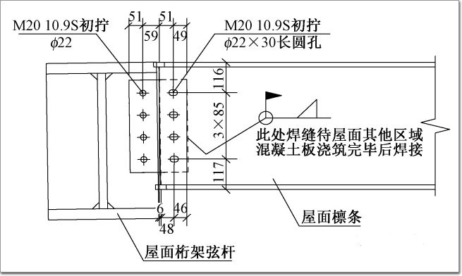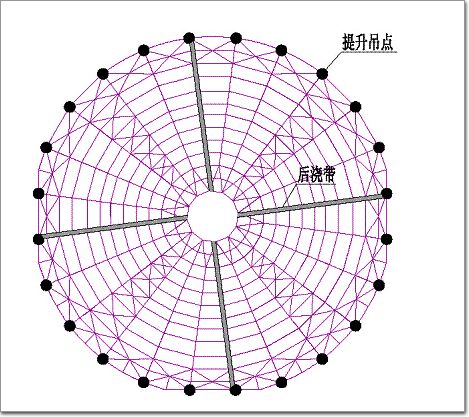 沿屋蓋徑向設(shè)置了4道混凝土后澆帶,后澆帶處檁條端部連接采用施工過程中軸向滑動、施工完成后固定的方式。檁條端部節(jié)點(diǎn)圖見圖9,屋蓋提升吊點(diǎn)和后澆帶劃分位置如圖,10所示。