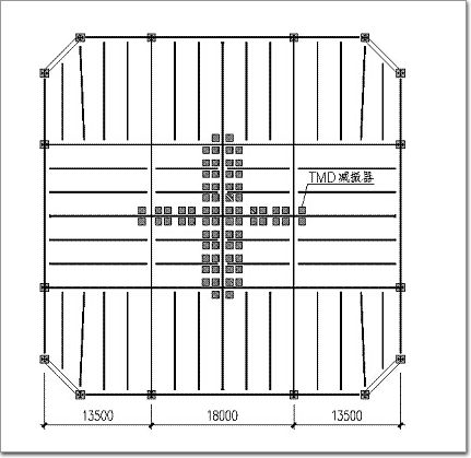 主會場樓面鋼結(jié)構(gòu)跨度45m,當(dāng)行人密集、人數(shù)較多時(shí),將會產(chǎn)生樓板豎向振動的舒適度問題,采用TMD消能減振系統(tǒng)改善結(jié)構(gòu)舒適度性能。在結(jié)構(gòu)的中部位置布置了共72個(gè)TMD,每個(gè)質(zhì)量為1t, TMD布置圖見圖11。