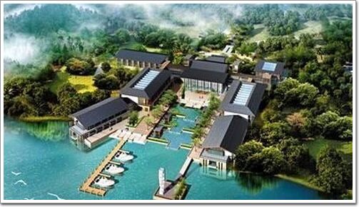 精品酒店與一個(gè)小碼頭相連,其建筑設(shè)計(jì)也體現(xiàn)了傳統(tǒng)中國韻味。由一組建筑圍合而成三面院落空間,俯瞰整體建筑如同一個(gè)“京”字,建筑風(fēng)格吸取了玻璃燈籠、花窗、坡屋頂?shù)戎袊鴤鹘y(tǒng)設(shè)計(jì)元素。另外,核心島與西側(cè)山腳通過公路橋梁相連,未來游客可通過陸路、水路上島游覽。