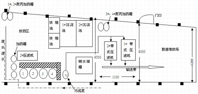 原廢水處理站有9臺板框壓濾機,板框壓濾機具有濾液基本不含顆粒物的優點,但也存在維修工作量大,工人勞動強度高等不足,尤其是其間斷作業方式,不僅工作效率低,且濾餅不能均勻摻混入皮帶,濾渣需要用布袋包裝堆放造成成本過高等缺點,而且隨著該公司生產規模加大,近年來經常出現濾渣堆滿廢水站,阻塞通道的情況發生,改裝帶式壓濾機可以解決大部分的問題。具體按以下幾點進行: