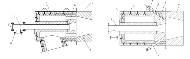 該燃燒裝置,主要應用于采用燃氣(煤氣或天然氣)作為燃料的熔鋁爐,其主體結構如下圖1和圖2所示。包括燒嘴本體1和爐體:燒嘴本體由主氣槍2、冷卻空氣進氣管3、燃料進氣管4、花磚5、燒嘴磚6、主火檢連接管7、小槍連接管8和錨固爪9組成。其中,主氣槍與燃料進氣管相接;主氣槍與花磚相連通,花磚與燒嘴磚連接;燒嘴磚與爐體連接。