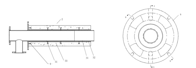 主氣槍:如圖3所示,主氣槍由內層鋼管31、中層纖維紙層32和外層澆注料(詞條“澆注料”由行業大百科提供)層33構成,該種特殊結構可以有效增強主氣槍的實用性、耐用性和穩定性。