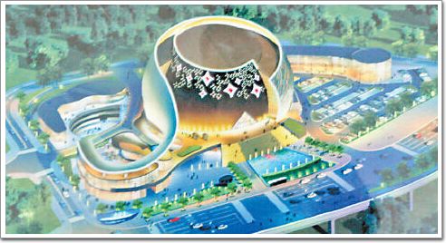 主館內設計了3個舞臺,一個是“鏡框舞臺”,也就是坐在觀眾席上,往前面看的普通舞臺,主要表演雜技等;一個是“馬圈舞臺”,這個圓弧形的舞臺直徑18米,約250平方米,主要是馬戲團的訓獸表演;在“馬圈舞臺”內,還設計有一個高位跳水池,水深達7米、面積70多平方米,也相當于一個表演的“舞臺”,在雜技、馬戲、魔術表演時都可能用上。