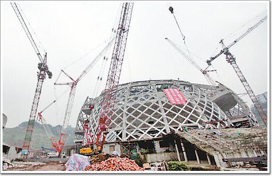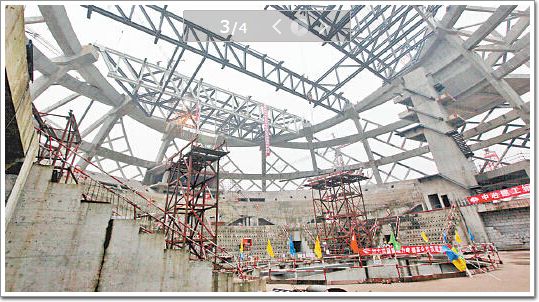 馬戲城開工后,主體施工隊伍于2013年3月進場。經過一年多的施工,今年11月21日,主館的主體結構完工。