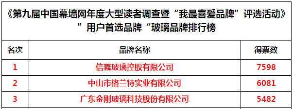 縱觀玻璃行業近幾年來的調整發展,從一家獨大,到百花齊放,充分證明了企業既要有拳頭產品,還要有叫得響的品牌。隨著行業的不斷發展,特別是在建筑玻璃產品領域,品牌就是企業生命力的內生源泉,品牌就是優質服務的前提保障,市場競爭歸根到底就是企業品牌的競爭,關乎著企業明天的生死存亡。因而從調查活動伊始,每一屆的用戶首選品牌獎項,都是關注度最高的版塊之一,隨著近年來,更多的企業重視品牌建設,該獎項的競爭有愈演愈烈之勢。本屆調查經過激烈角逐,“用戶首選品牌”獎前三甲分別由信義玻璃控股有限公司、中山市格蘭特實業有限公司以及廣東金剛玻璃科技股份有限公司獲得。(見圖1)