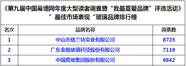 企業要生存,就需要占領市場,建立穩步增長的用戶群體。通過來自全國各地讀者(用戶)的投票,每一屆調查的“最佳市場表現”獎,反映出眾多品牌,在當年度里,產品的市場流通情況,通過對這些數據的統計分析,我們羅列出每一個入圍品牌的市場占有率排名。本屆“最佳市場表現” 獎,分別由中山市格蘭特實業有限公司、廣東金剛玻璃科技股份有限公司以及中國南玻集團股份有限公司摘得前三名。(見圖2)