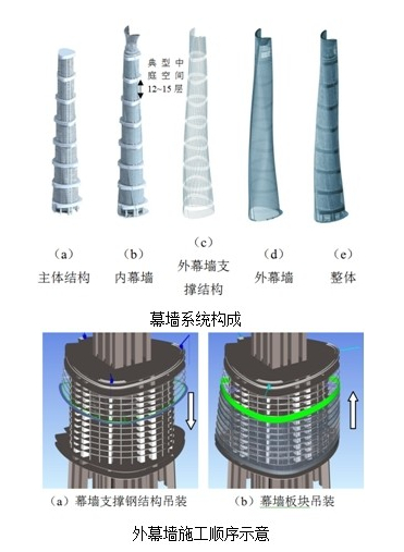 超高層建筑的顯著特點之一。外幕墻平面形狀呈一個三邊鼓曲、三角倒角的等邊三角形,在高度方向,繞著圓柱體樓面逐層旋轉、收縮向上,由此導致內外幕墻在空間上分離。整個外幕墻系統被外伸的設備層在垂直方向上分成相對獨立的9個區域(9區為塔冠區),每個區在內外幕墻之間形成寬度變化并向上延伸的12~15層、高約55~66m的流線形