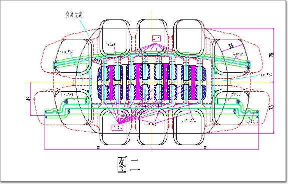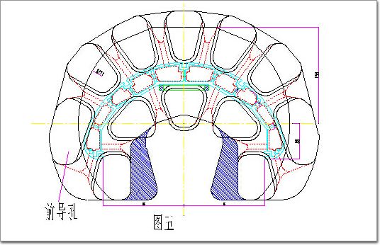 難點分析:該型材幾何尺寸較大,型材外接圓超出了2500噸擠壓機模具進料孔極限,屬于典型的“小機出大料”情況。而且,該型材有九個空腔,形狀復雜,這類型材在生產過程中最大的難點是模具強度問題,由于九個小模芯的受力很難平衡,在受力不均的情況下,模芯容易發生嚴重偏壁,甚至斷裂,此外,由于型材中間的空腔較大,模具的擠壓死區面積過大,造成擠壓力(詞條“擠壓力”由行業大百科提供)升高,模具變形(詞條“變形”由行業大百科提供)較大,在生產過程中極易出現斜角,波浪等缺陷,甚至模具會發生裂橋報廢。為了有效避免上述問題的產生,必須要從改善模具的供料結構入手,使模具各部分的供料均勻,模芯受力平衡。因此,我們在設計模具時采取“前導孔”的模具結構,如圖2所示,上模剖視圖如圖3所示。